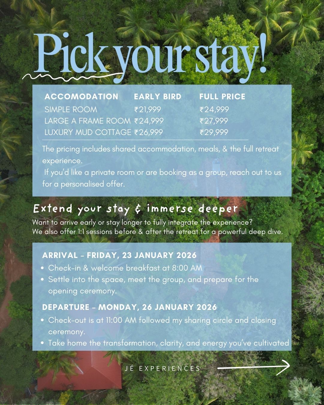 Extend your stay before and/or after the retreat, at a small additional cost.